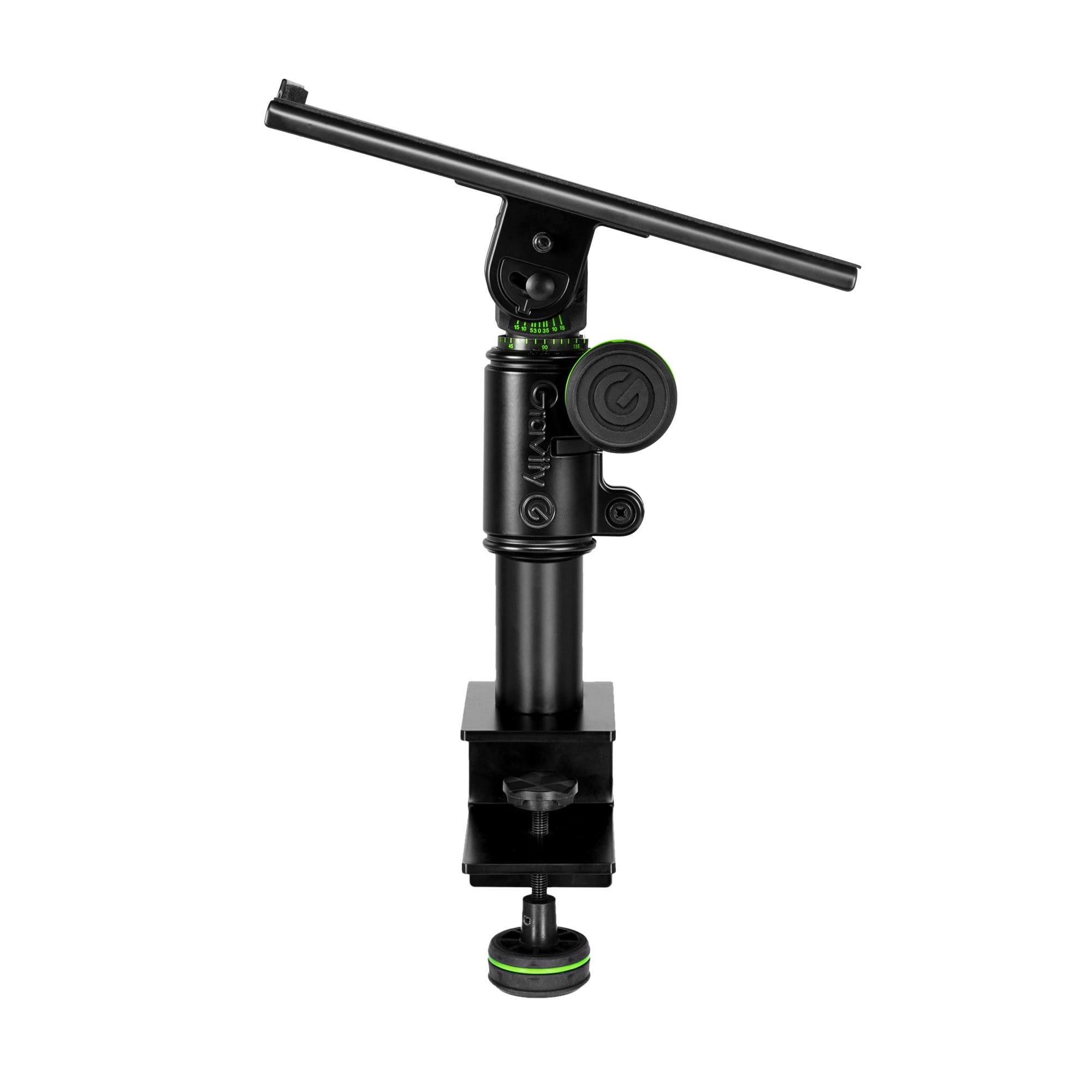 Gravity® rozwiązuje wszystkie te problemy dzięki statywowi SP 3102 TM. Statyw do monitora studyjnego wyposażony jest w zacisk stołowy zapewniający bezpieczne przymocowanie konstrukcji do stołów o blatach nie grubszych niż 100 mm. Podobnie jak inne produkty Gravity, można go dokręcić za pomocą mocnego i wygodnego pokrętła. W przeciwieństwie do konwencjonalnych statywów stołowych, które do zachowania stabilności wymagają dużej płyty podstawy, podstawa zaciskowa SP 3102 TM ma wymiary zaledwie 10 × 7 cm i nie zajmuje więcej miejsca niż standardowy uchwyt ekranu. Inteligentna konstrukcja statywu do monitorów studyjnych sprowadza się do faktu, że powinien on zapewniać aby monitory nie wystawały zbyt daleko na stole. Daje to w efekcie większą odległość między słuchaczem a monitorami, nawet jeśli stoły nie są tak szerokie, a także zapewnia idealne rozmieszczenie głośników, aby znaleźć optymalny punkt w pomieszczeniu.