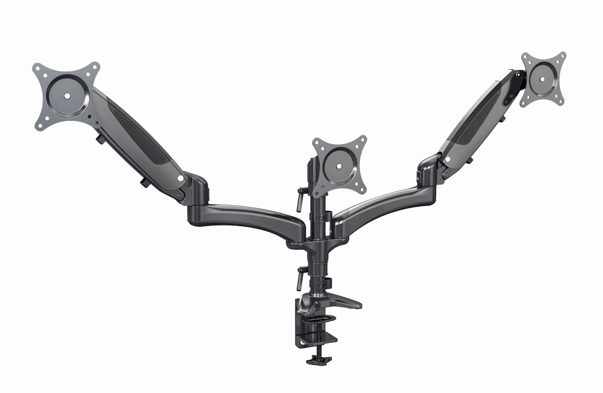 Za pomocą tego uchwytu stołowego można umieścić trzy monitory o rozmiarze do 24" zajmując mało miejsca i ergonomicznie.