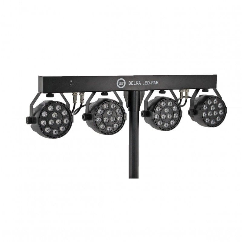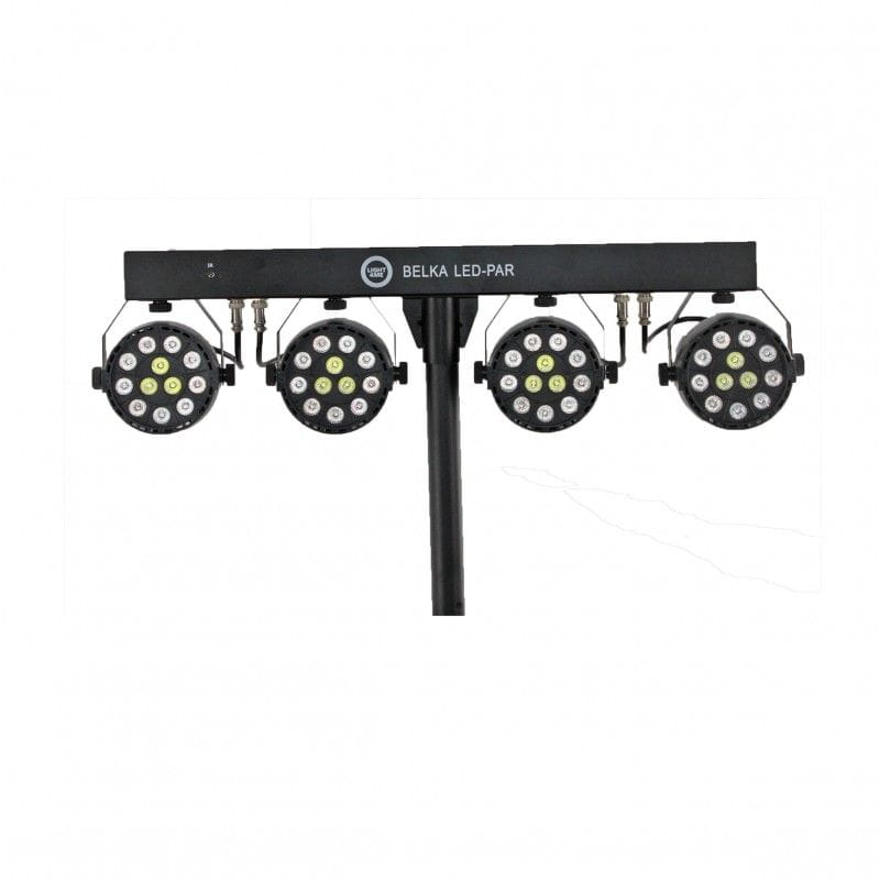 LIGHT4ME BELKA LED PAR to kompletny zestaw oświetleniowy, w skład którego wchodzą listwa mocująca, cztery reflektory LED PAR wyposażone w 12 jednowatowych diod LED pracujących w palecie kolorów RGBW (red, green, blue, white), solidny statyw, pilot oraz dwa pokrowce (na statyw i belkę).