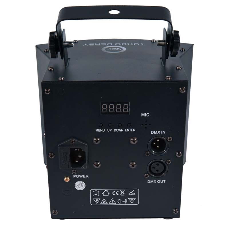 LIGHT4ME TURBO DERBY to jedna z najnowszych i tańszych propozycji popularnego multiefektu LED typu derby, teraz z możliwością sterowania za pomocą bezprzewodowego pilota. Urządzenie wyposażone zostało w dziewięć mocnych, 3-watowych diod LED (4w1) oraz układ sześciu diod LED operujących światłem ultrafioletowym (UV). Reflektor posiada również uzupełniający układ dwóch laserów emitujących czerwoną i zieloną wiązkę skupionego światła, dodających ekspresji efektom wizualnym.