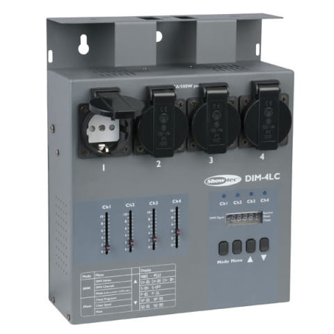 DIM-4LC to nowy, zgodny w wymogami ograniczonej emisji EMC, 4-kanałowy dimmer (regulator) z możliwością regulacji suwakiem każdego kanału, posiada 16 wbudowanych programów sterowanych dźwiękiem. Prędkość programów może być regulowana.